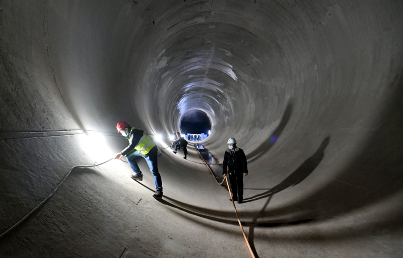 工作人員正在向家壩灌區北總干渠一期工程龍洞巖隧洞工程內檢查電纜