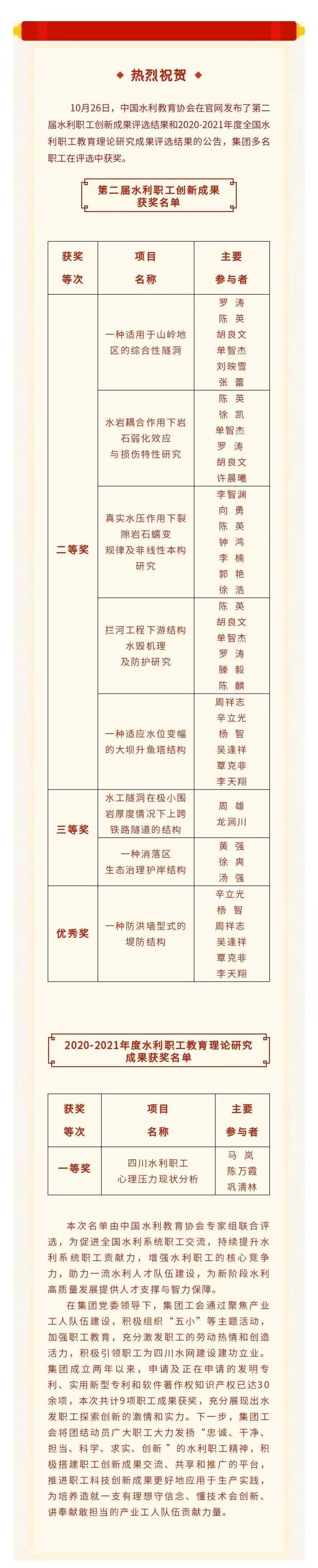 喜報!集團(tuán)在第二屆水利職工創(chuàng)新成果獲獎名單和2020-2021年度水利職工教育理論研究成果獲獎名單出爐