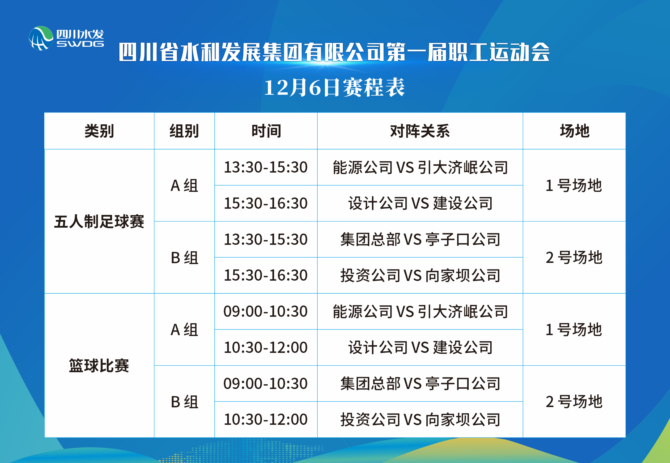 此次運(yùn)動會分為2個(gè)階段。12月5日-12月8日為預(yù)賽階段,比賽項(xiàng)目包括:五人制足球賽、籃球賽、羽毛球混合團(tuán)體賽、乒乓球混合團(tuán)體賽,來自集團(tuán)總部及7個(gè)下屬公司共220余名運(yùn)動員以循環(huán)賽和排位賽的方式角逐4個(gè)類別,8個(gè)決賽名額。12月9日,將舉行此次運(yùn)動會開閉幕式,球類比賽決賽以及趣味運(yùn)動會。