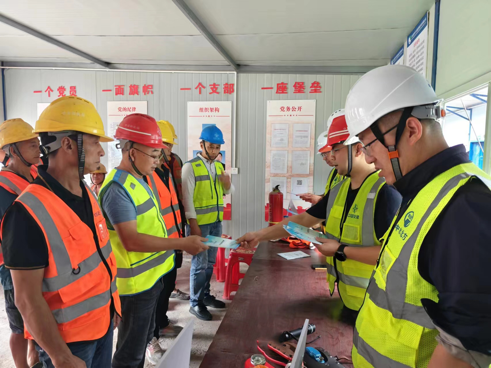 廣泛宣傳,營造安全生產氛圍。在辦公駐地和施工現場設置安全宣傳欄、懸掛安全標語、警示橫幅、制作安全宣傳畫報,并常態化開展班前講話,將安全理念“聲”入人心。第IV標段項目部組織業主單位、項目經理、建設現場一線人員,在騎子寨施工現場開展“安全宣傳咨詢日”活動。通過發放安全應急知識手冊等形式,向現場管理人員及一線工人宣傳安全應急知識、科普安全生產、應急避險和自救互救、職業健康等方面的知識,及時解答現場人員關心的安全生產問題,營造“人人講安全、個個會應急——暢通生命通道”的良好工作氛圍。