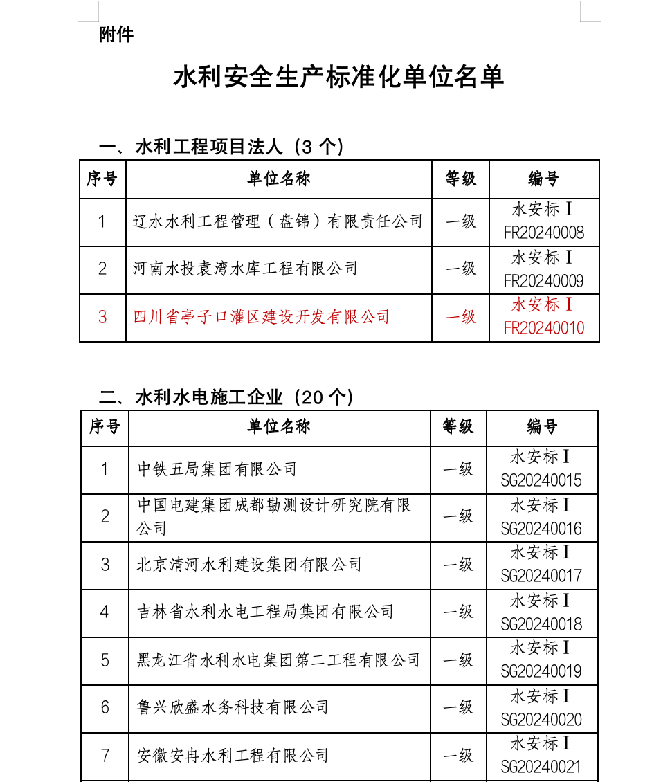 8月7日,水利部公布最新一批水利安全生產標準化一級達標單位名單,亭子口公司光榮上榜。水利安全生產標準化等級是體現水利生產經營單位安全生產管理水平的“國家級”重要標準,一級達標是水利行業安全達標的最高等級,本批名單中項目法人達標全國僅有3家單位。